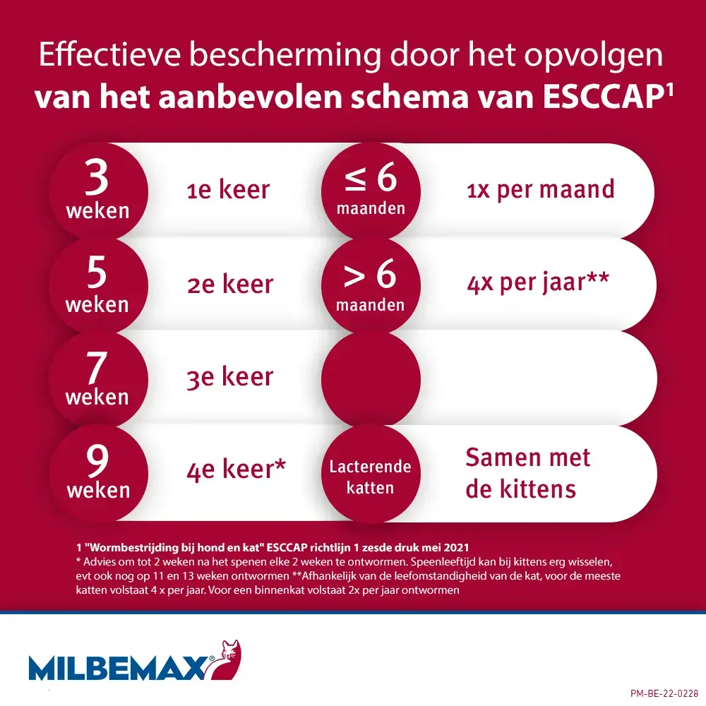 Milbemax is werkzaam tegen de belangrijkste spoelwormen, lintwormen en haakwormen en werkt daarnaast preventief tegen hartwormen. Omdat Milbemax een orale behandeling is, komt de juiste dosis direct in het darmkanaal terecht. Dit maakt het een doeltreffend middel zonder knoeien. Milbemax kan gegeven worden aan katten vanaf 2kg lichaamsgewicht, en is geschikt voor drachtige en zogende katten. Het is niet nodig om uw kat tijdens en na de behandeling af te zonderen van andere huisdieren en u kunt er gerust op zijn dat contact met uzelf en uw gezin na een behandeling met Milbemax veilig is.