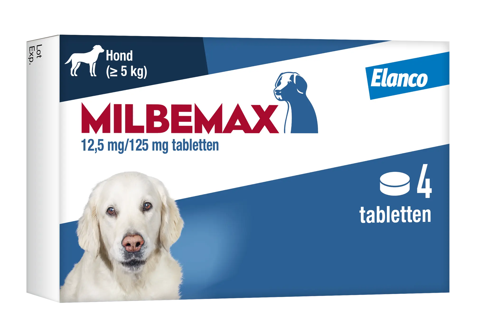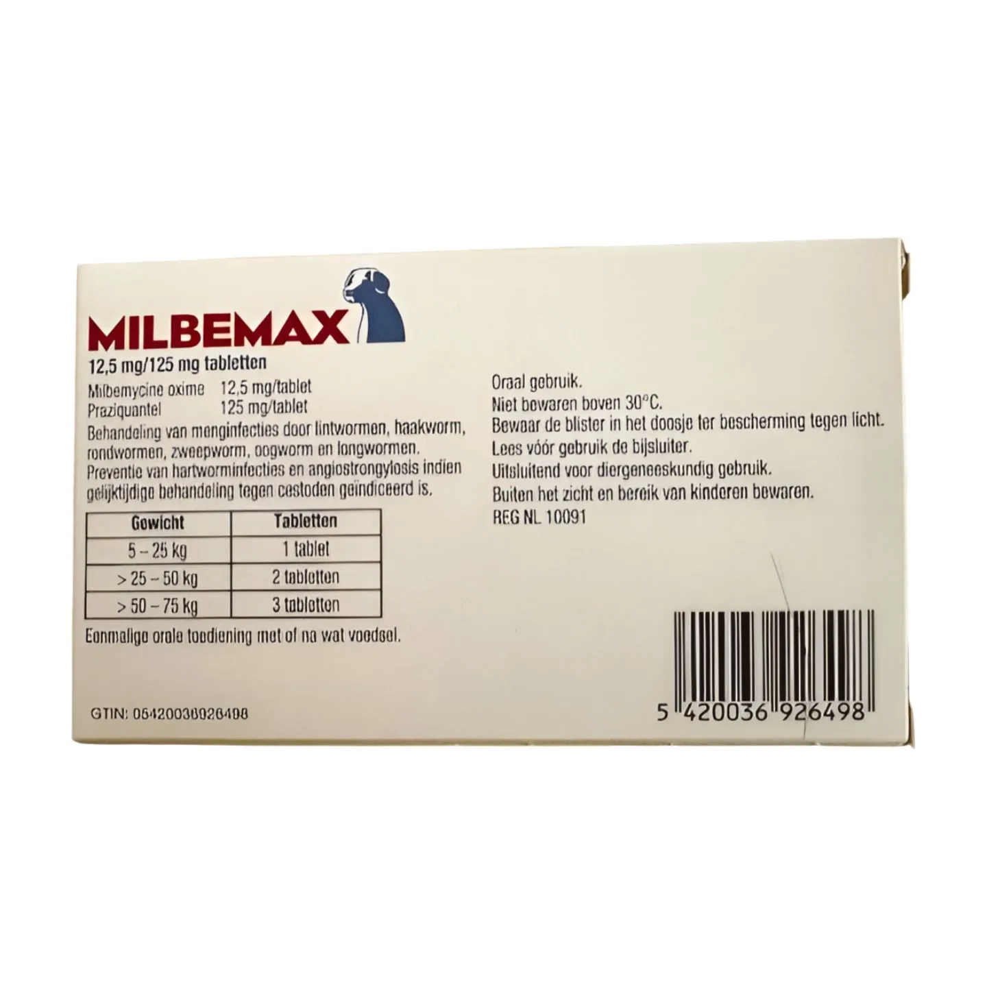 Milbemax Hond Groot 4 Ontworming Tabletten zijn rondgevormde, witte tabletten voor de behandeling van infecties, veroorzaakt door haak-, rond-, oog-, long- en lintwormen en voor de preventie van hartwormen en angiostrongylosis bij honden vanaf 5 kg lichaamsgewicht. De werkzame bestanddelen zijn per tablet: Milbemycine oxime 12,5 mg en Praziquantel 125 mg. Niet toedienen aan honden die minder dan 5 kg wegen. Niet gebruiken bij overgevoeligheid voor de werkzame bestanddelen of één van de hulpstoffen.
