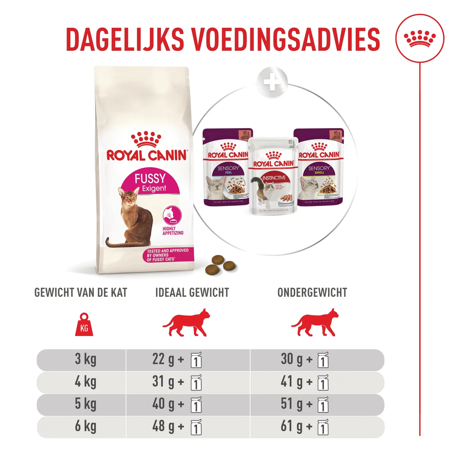 Royal Canin Fussy is speciaal ontwikkeld voor volwassen, kieskeurige katten die de neiging hebben om hun voeding te laten staan. Het voeden van kieskeurige eters kan een uitdaging zijn. Onze gebalanceerde formule is ontwikkeld door experts in kattenvoeding om zelfs de meest kieskeurige katten tevreden te stellen. Deze op maat gemaakte voeding is gebalanceerd en zeer smakelijk, dankzij de speciale samenstelling van aroma's en een krokante broktextuur. Royal Canin Fussy is zorgvuldig samengesteld om te voldoen aan de unieke behoeften van kieskeurige eters en biedt voeding die zelfs de meest kieskeurige katten aanspreekt.