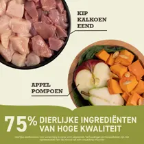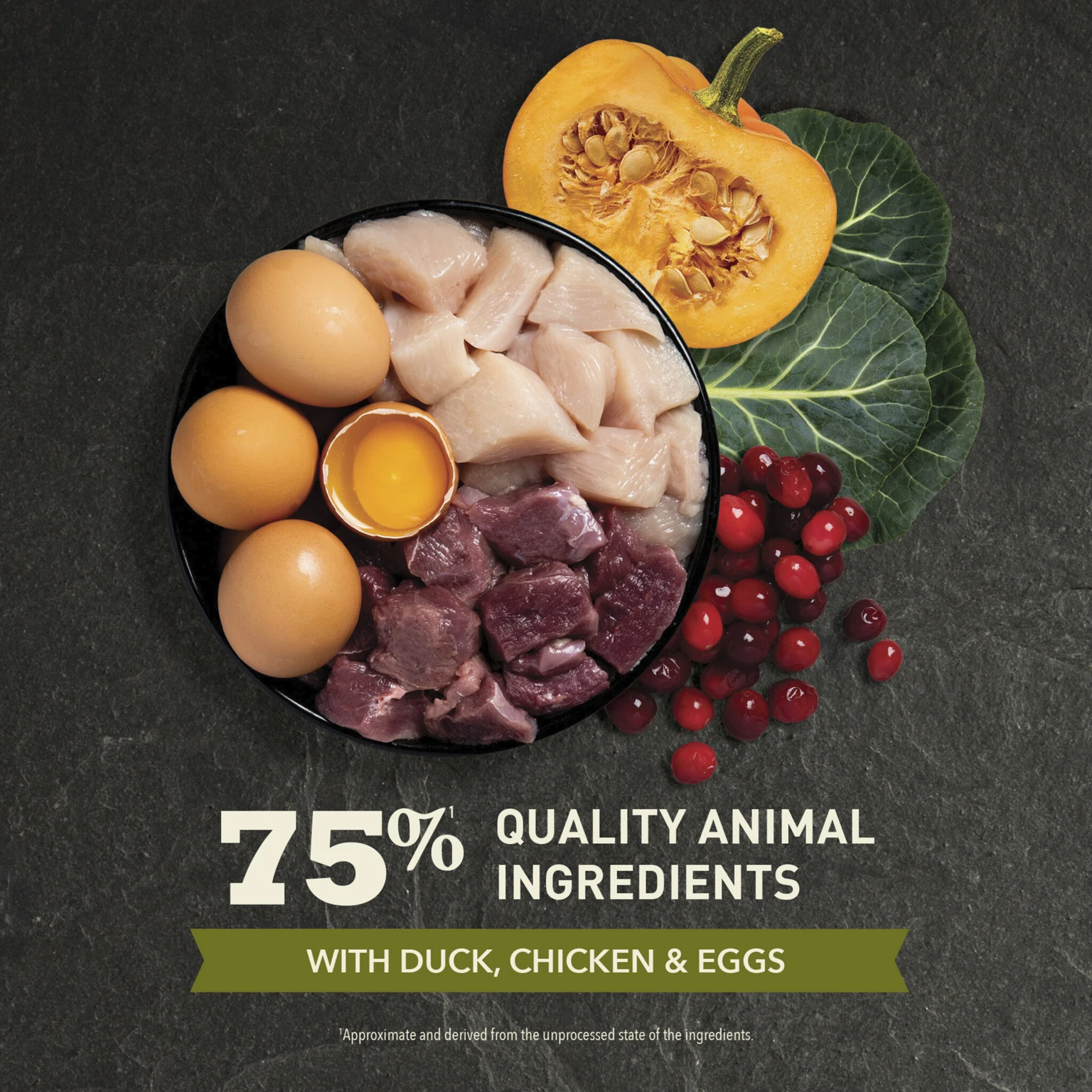 Samenstelling: vers eendenvlees (11%), vers kippenvlees (11%), verse scharreleieren (8%), gedroogde kip (7%), gedroogde kalkoen (7%), gedroogde witvis(7%), hele pintobonen, hele erwten, vers kalkoenvlees (6%), eenden vet (5%), hele rode linzen, hele kikkererwten, hele groene linzen, rauw kwartel vlees (4%), vers kippen orgaanvlees (lever, hart) (2%), koolvis olie (2%), vers kalkoen orgaanvlees (lever,hart) (2%), linzen vezel, gedroogd eendenvlees (1%), eendenlever (1%), eendenkraakbeen (0.5%), gevriesdroogde kippen en kalkoen levers (0.5%), gedroogd zeewier, verse hele pompoen, verse hele muskaat pompoen, verse boerenkool, verse spinazie, verse raapstelen, verse wortels, verse appels, verse peren, verse hele cranberry, verse hele bosbes, cichoreiwortel, kurkuma, mariadistel, kliswortel, lavendel, heemstwortel, rozenbottels