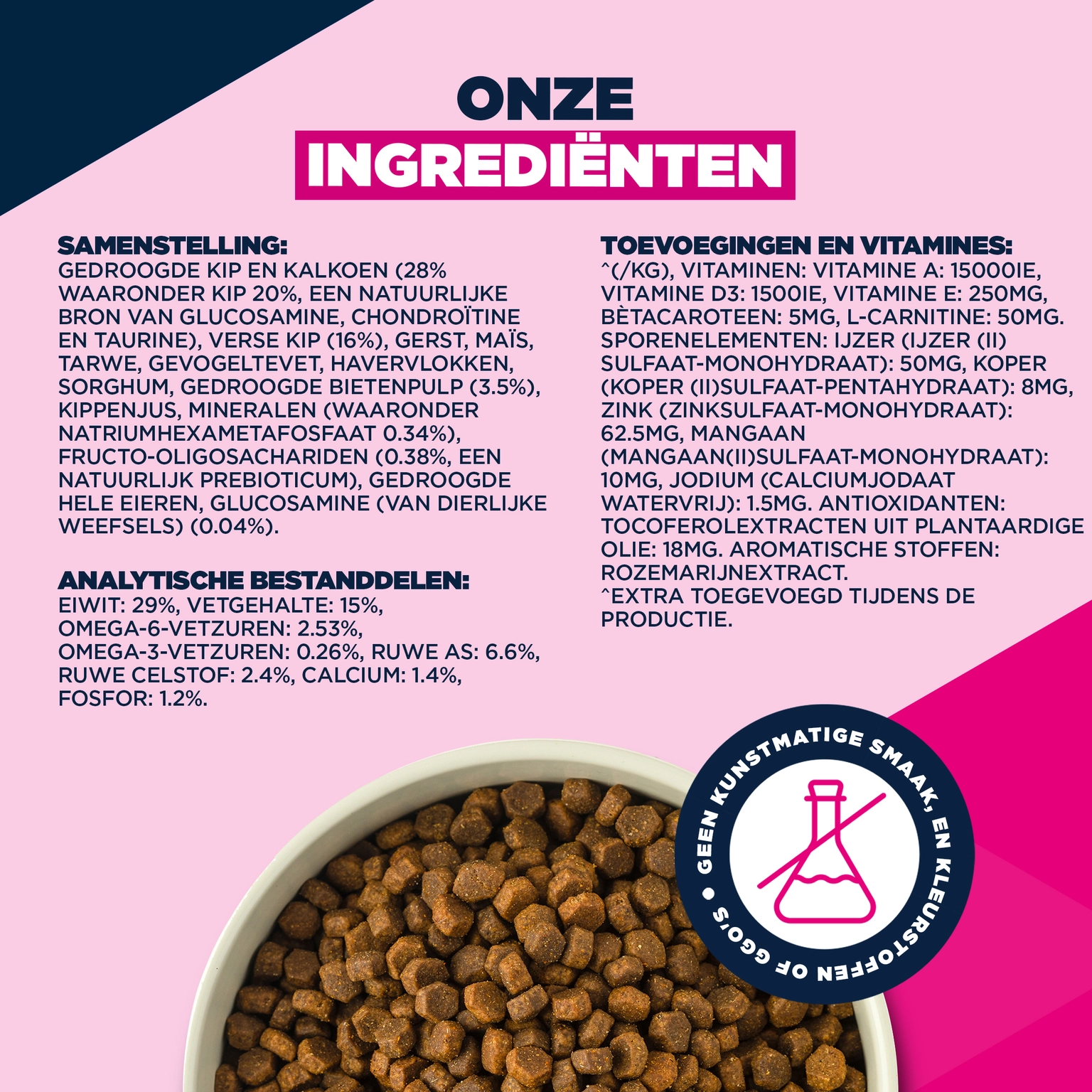 Samenstelling: Gedroogde kip en kalkoen (25% waaronder kip 15%, een natuurlijke bron van glucosamine, chondroïtinesulfaat en taurine), verse kip (16%), maïs, tarwe, gevogeltevet, havervlokken, gerst, sorghum, gedroogde bietenpulp (3.5%), vismeel (een natuurlijke bron van omega-3-vetzuren), kippenjus, mineralen (waaronder natriumhexametafosfaat 0.34%), gedroogde hele eieren, fructo-oligosachariden (0.38%, een natuurlijk prebioticum), glucosamine (van dierlijke weefsels) (0.04%)
