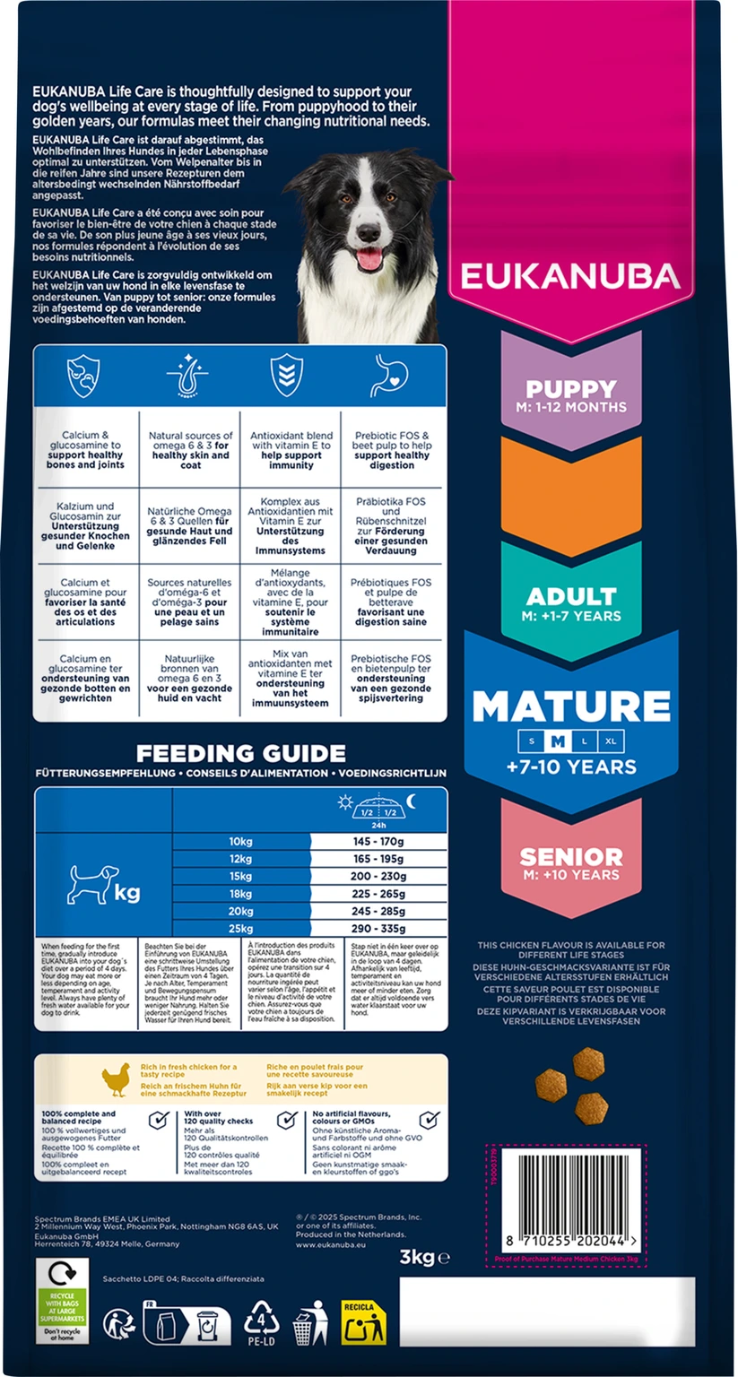 EUKANUBA Life Care biedt wetenschappelijk onderbouwde hoogwaardige voeding om te voldoen aan de veranderende behoeften van honden in elke levensfase. Dit droogvoer, samengesteld met verse kip, is speciaal ontwikkeld voor middelgrote, oudere honden van 7 tot 10 jaar. De geselecteerde ingrediënten bieden voeding op maat om gezond ouder te worden en de algehele vitaliteit te ondersteunen.