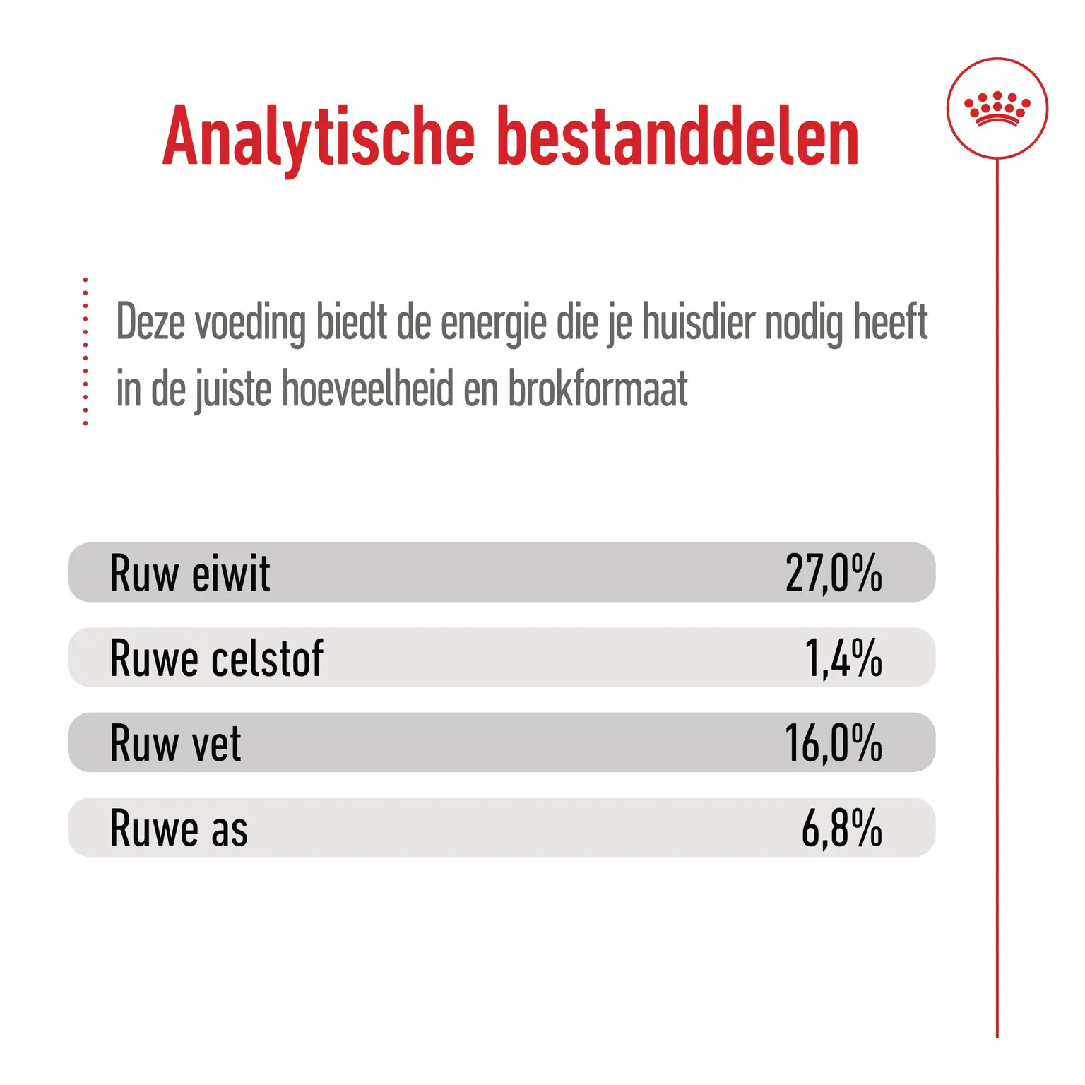 Samenstelling: tarwemeel, gedehydreerde gevogelte-eiwitten, maïsmeel, dierlijke vetten, gehydrolyseerde dierlijke eiwitten, gedehydreerde varkenseiwitten, maïs, gerst, maïsgluten, tarwe, mineralen, bietenpulp, sojaolie, gistproducten, fructo-oligosachariden, visolie, algenolie Schizochytrium sp.