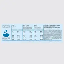 Zie tabel, geef meer of minder om het ideale gewicht van uw hond te behouden. Raadpleeg bij twijfel de deskundige verkopers in onze winkel in Amstelveen. Vers water moet dagelijks ter beschikking staan. Bewaar de afgesloten zak op een koele, droge plaats. Buiten bereik van kinderen bewaren. Dit is niet bedoeld voor menselijke consumptie.
