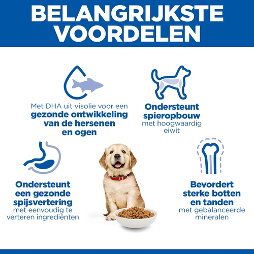 Klinisch bewezen voeding die het leven van uw hond wezenlijk kan veranderen. HILL'S SCIENCE PLAN Large Breed Puppy met Kip is speciaal gemaakt met een optimaal calciumgehalte voor gecontroleerde botgroei, een unieke ontwikkelingsbehoefte van pups van grote rassen. Geef ze de beste start van hun leven om hun volle potentieel te kunnen bereiken.