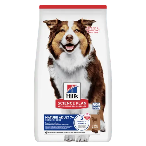Hill’s Science Plan Mature Adult Medium hondenvoer met Lam & Rijst is samengesteld voor specifieke verouderingsbehoeften. Het is een gemakkelijk te verteren voeding met een synergetische mix van ingrediënten om het energie- en activiteitsniveau te helpen ondersteunen. Het bevat omega 6-vetzuren & vitamine E voor een mooie huid & vacht, hoogwaardig lam en rijst voor een gezonde spijsvertering en gebalanceerde mineralen voor de gezondheid van het hart en de nieren.