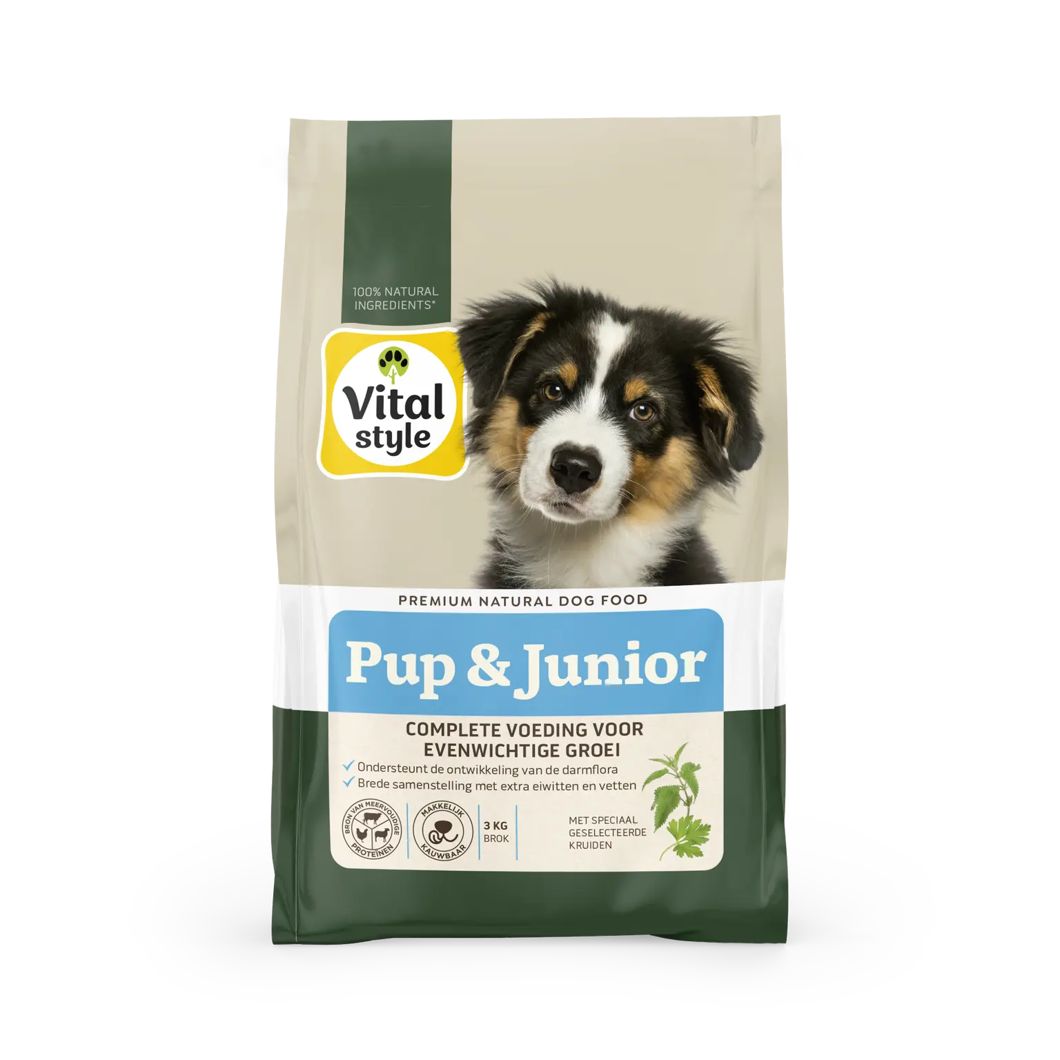 Vitalstyle Pup & Junior hondenbrokken is 100% natuurlijk. De complete voeding bevat alles wat de puppy nodig heeft. Pup & Junior is goed verteerbaar en ondersteunt de ontwikkeling van een sterke hond en zijn darmflora door de brede samenstelling. De kruiden in de puppybrokken ondersteunen de jonge hond in ontwikkeling, waarbij de prebiotica het behoud van een gezonde spijsvertering ondersteunt.