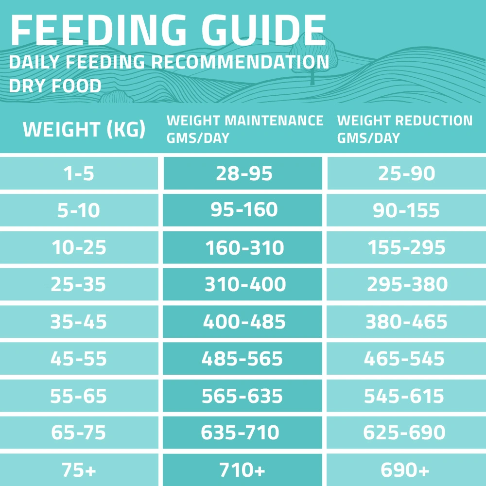 Het gewicht, de leeftijd, het activiteitsniveau, het temperament, de spijsvertering en de stofwisselingssnelheid van uw huisdier kunnen van invloed zijn op de hoeveelheid voer die nodig is. De aanbevolen voertabel is te vinden op de achterzijde van de productgids die u gratis kun aanvragen bij ons.