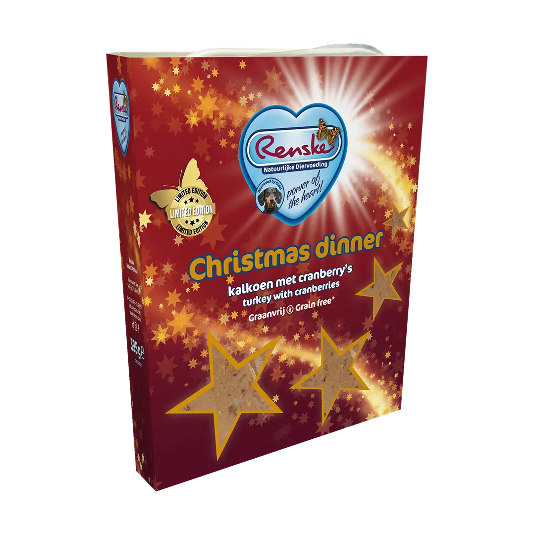 Met Kerst eten we allemaal extra lekker en uw hond houdt daar ook vast van. Renske Vers Kerstdiner met Kalkoen&Cranberry is een complete vers vlees voeding voor honden, zo heeft uw hond ook Kerst! Het is ook leuk om Renske Vers Kerstdiner Kalkoen met Cranberry’s cadeau te geven of te krijgen.