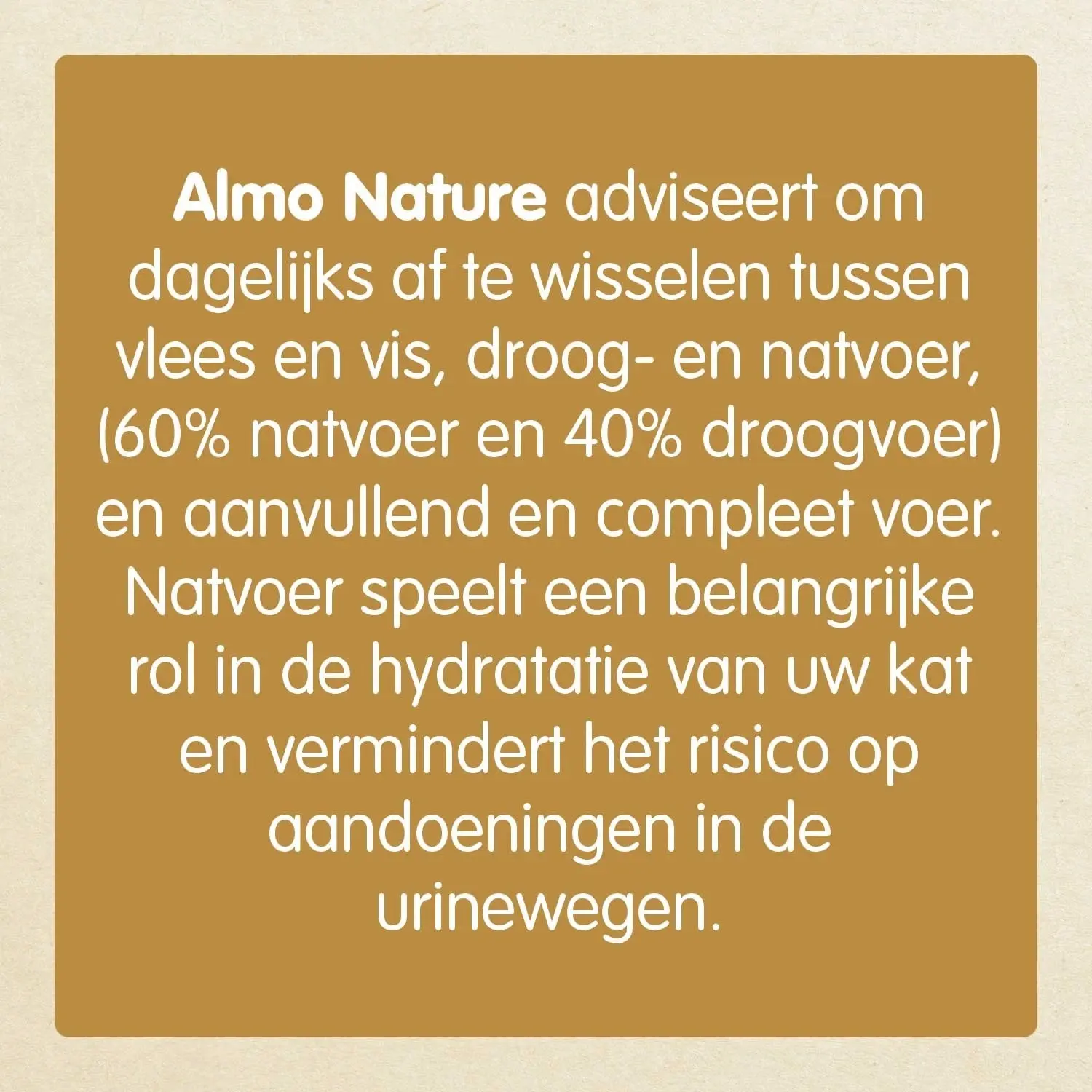 Katten zijn van nature echte vleeseters, het is daarom belangrijk dat kittens ook echt vers vlees binnen krijgen voor een optimale ontwikkeling. Dit natvoer voor kittens bevat 50% verse kip die van origine geschikt is voor menselijke consumptie. Hierbij wordt dezelfde kwaliteit ingrediënten gebruikt als die zijn toegevoegd aan voeding voor mensen. De verse kip wordt in eigen kookvocht geconserveerd waardoor de smaak zo goed mogelijk behouden blijft. Afwisseling is ontzettend belangrijk voor een gebalanceerde voeding voor uw opgroeiende kat. Geadviseerd wordt daarom natvoer af te wisselen met droge brokjes. Voor een optimale voedingsbalans adviseert Almo Nature de kat dagelijks 60% natvoeding en 40% droogvoeding te geven voor een 100% voedingsbalans. Almo Nature heeft ook een speciaal droogvoer voor kittens ontwikkeld.