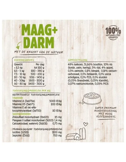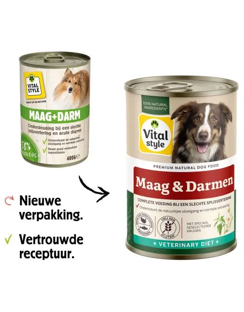 Vitalstyle Maag & Darmen natvoer is 100% natuurlijk. De complete voeding bevat alles wat de hond met een gevoelige spijsvertering nodig heeft. Maag & Darmen is goed verteerbaar en bevat een laag vetgehalte. De extra elektrolyten in Maag & Darmen natvoer ondersteunen een gezonde waterhuishouding in de darm bij absorptiestoornissen en bij verminderde opname van voedingsstoffen in de darmen. De veterinaire voeding ondersteunt de natuurlijke stoelgang en normale ontlasting. De natuurlijke ingrediënten en speciale kruiden in Maag & Darmen ondersteunen de maag- en darmwerking en het behoud van een gezonde spijsvertering.