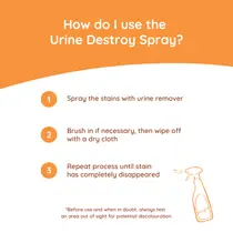 Spuit de vlekken in met de Urineverwijderaar, desgewenst inborstelen en daarna met een droge doek afwrijven. Dit eventueel herhalen totdat de vlek geheel is verdwenen. Voor gebruik een onopvallend deel van de stof op kleurechtheid testen.