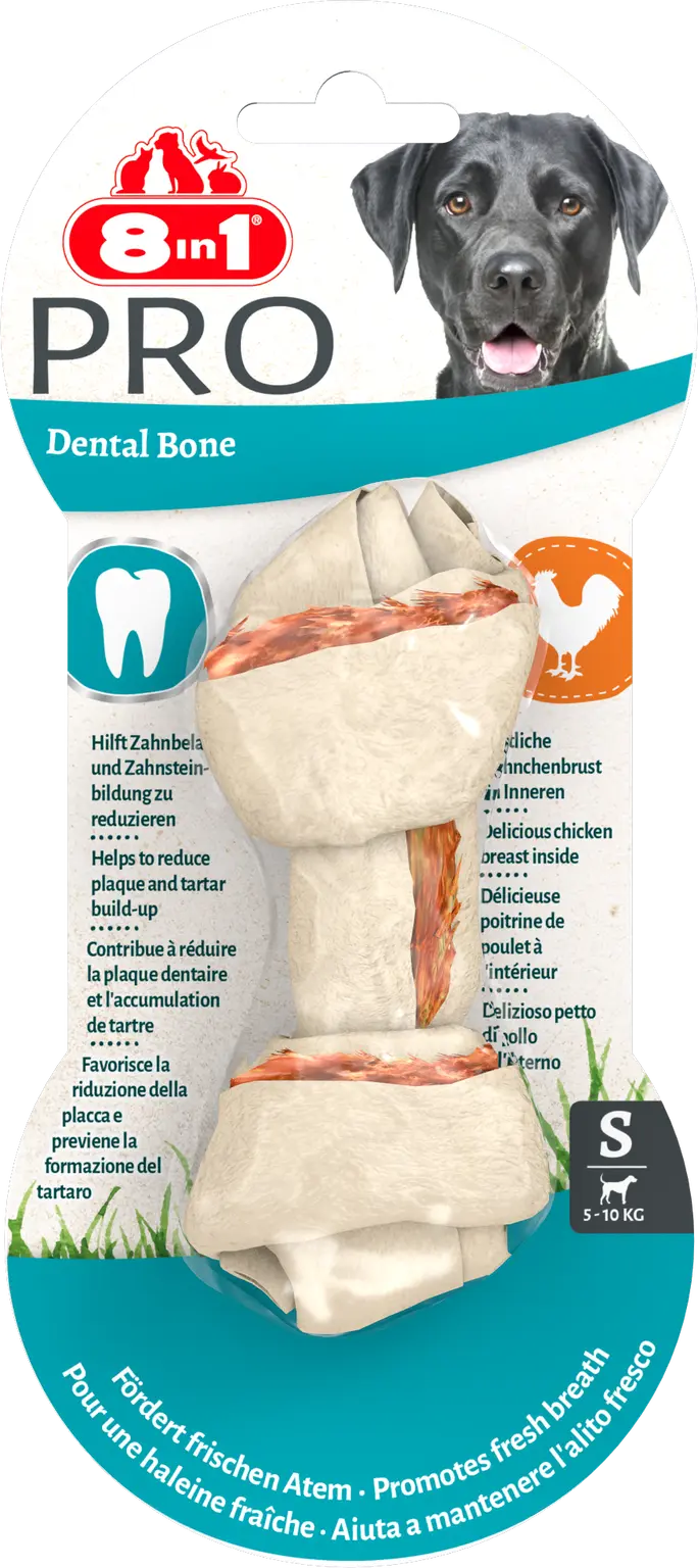 8in1 Delight Pro Dental Knoopkluif Small wordt aanbevolen voor honden van kleine en middelgrote rassen (2-27 kg). Het is een lekker knoopkluifje met kippenvlees en gebits-reinigende mineralen. De speciale vorm biedt langdurig kauwplezier voor kleine en middelgrote viervoeters. Voor een frisse adem en minder tandplak.