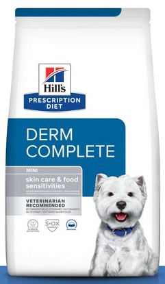 Hill's PRESCRIPTION DIET Derm Complete Mini hondenvoer is een volledig dieetvoeder voor de ondersteuning van de huidfunctie bij huidaandoeningen en overmatige haaruitval bij honden en voor de vermindering van intoleranties voor bepaalde ingrediënten en/of voedingsstoffen bij volwassen honden. Dit dieetvoeder bevat hoge gehalten aan essentiële vetzuren, een hoog gehalte aan linolzuur en een hoog gehalte aan eicosapentaeenzuur en docosahexaeenzuur tezamen en alsook een geselecteerd en beperkt aantal eiwit- en koolhydraatbronnen.