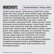 Verse kip (31%), rauwe kalkoen (8%), rauwe zalm (6%), rauwe hele haring (5%), Vers kippen orgaanvlees (lever, hart en nier) (4.5%), rauwe kalkoen lever (4%), rauwe hele makreel (4%), verse eieren (4%), gedroogde kip (4%), gedroogde kalkoen (4%), gedroogde haring (4%), gedroogde kippen lever (4%), gedroogde eieren (4%), hele rode linzen, hele erwten, koolvis olie (3%), hele kikkererwten, hele groene linzen, hele pinto bonen, hele witte bonen, erwtenzetmeel, gemalen miscanthus gras, kippen vet (0,5%), verse hele pompoen, verse hele muskaat pompoen, gedroogd zeewier, gedroogde cichoreiwortel, verse hele appels, verse hele wortels, verse hele peren, verse hele courgette, vers bieten loof, verse boerenkool, verse spinazie, verse raapstelen, hele bosbessen, hele veenbessen, hele saskatoon bessen, kliswortel, lavendel, heemstwortel, mariadistel, rozenbottels, kurkuma