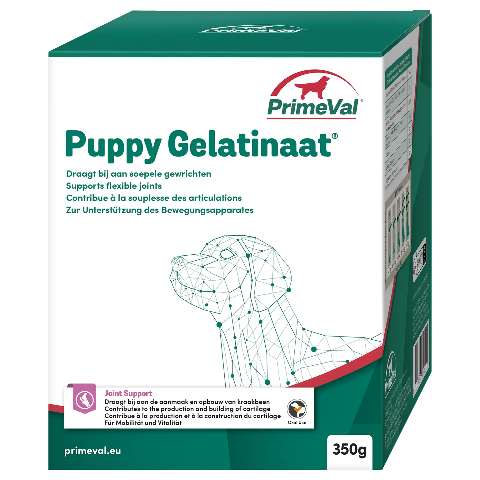 PrimeVal Gelatinaat Puppy: Speciaal ontwikkeld voor pups vanaf 8 weken oud. Het ondersteunt de ontwikkeling van het bewegingsapparaat tijdens de groeifase.