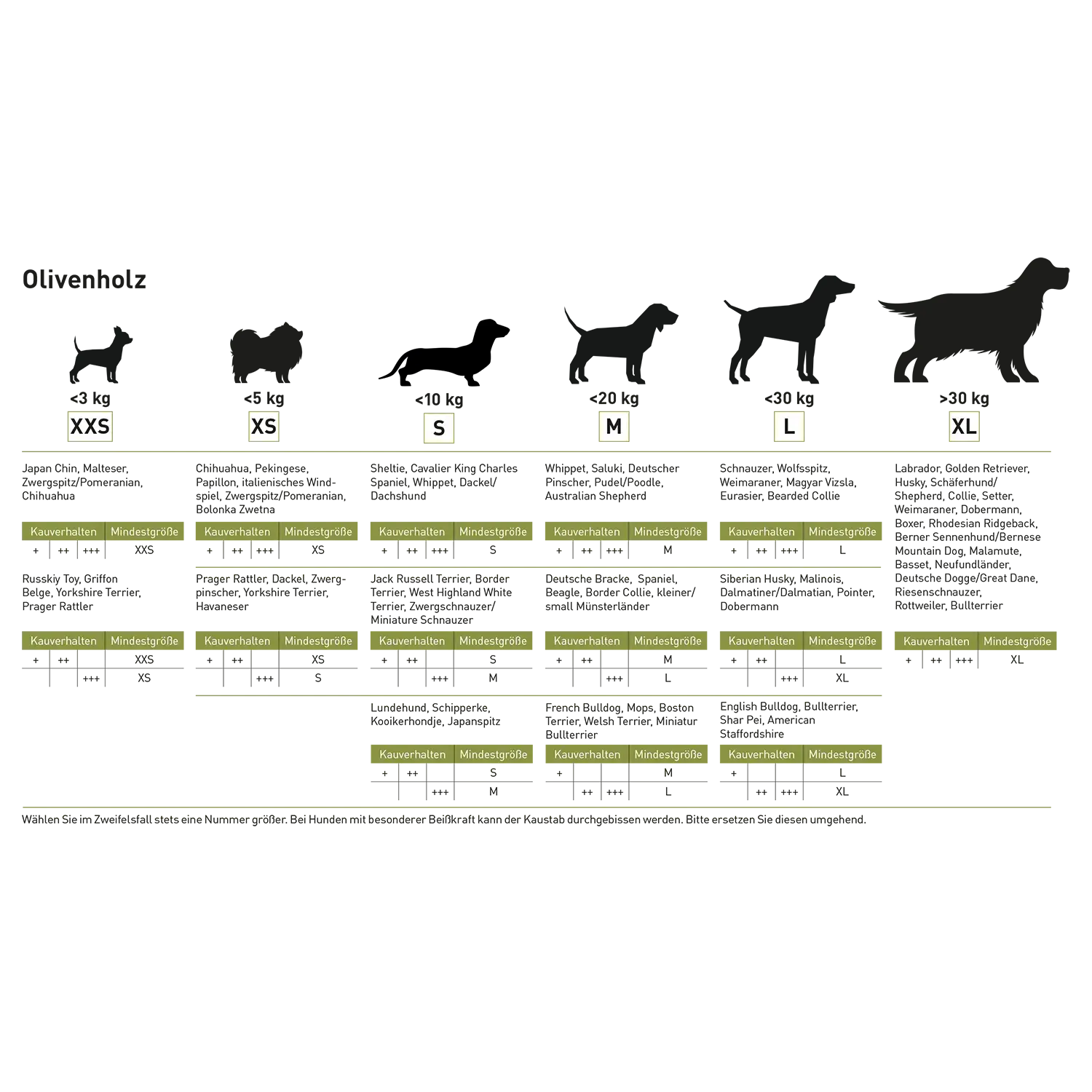 Kies de juiste maat voor uw hond en laat het speel- en kauwplezier beginnen. Het olijfhout mag niet achter de achterste kiezen kunnen worden meegenomen. Heeft uw hond een stevige beet, kies dan bij twijfel een maat groter. Als het olijfhout na een paar weken een formaat heeft bereikt dat uw hond kan inslikken, ruil het dan in voor een nieuw exemplaar. Buiten bereik van kinderen bewaren.