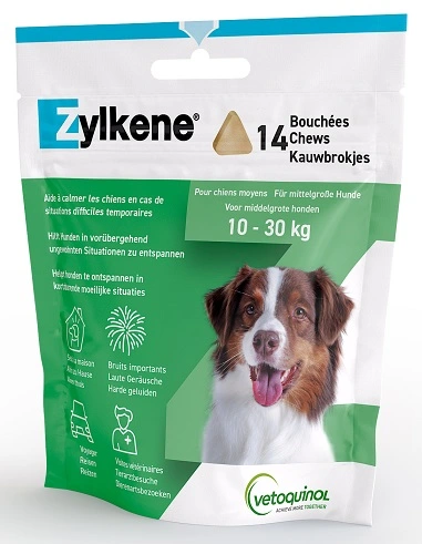 Geef Zylkene één keer per dag, als capsule of als kauwbrokje. Korte-termijn gebruik: Start met het geven van Zylkene 1-2 dagen vóór de voorspelde spannende situatie. Dieren die reeds uit balans zijn, geeft u best 5-7 dagen op voorhand Zylkene. Lange-termijn gebruik: Geef Zylkene dagelijks gedurende 1 maand en evalueer nadien het effect. Het is aan te raden om bij langdurige uitdagende situaties ook steeds contact op te nemen met een dierenarts of gedragstherapeut. Zylkene is een voedingssupplement. Het dient niet ter vervanging van een normale, evenwichtige voeding. Buiten bereik van kinderen bewaren. Inhoud: 14 stuks kauwbrokjes