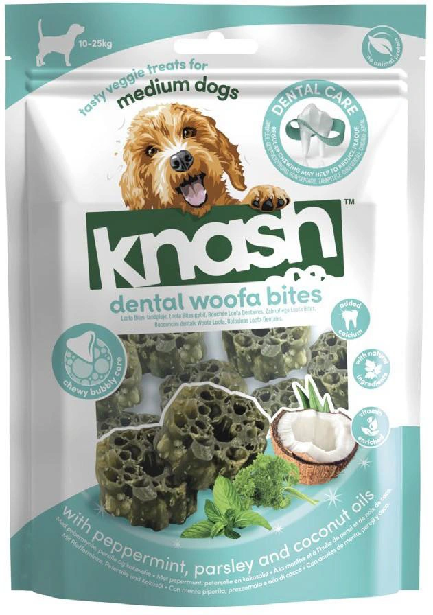 Geef je hond elke dag een reden om te glimlachen! Knash Woofa Bites Dental pepermunt en peterselie ondersteunen de dagelijkse gebitsverzorging, helpen tandplak te verminderen en zorgen voor langdurige frisheid met een smaak waar honden dol op zijn. Gemaakt van natuurlijke ingredienten, geen kunstmatige kleur – en smaakstoffen. Graanvrij en vegetarisch recept voor een makkelijke vertering, hypoallergeen.