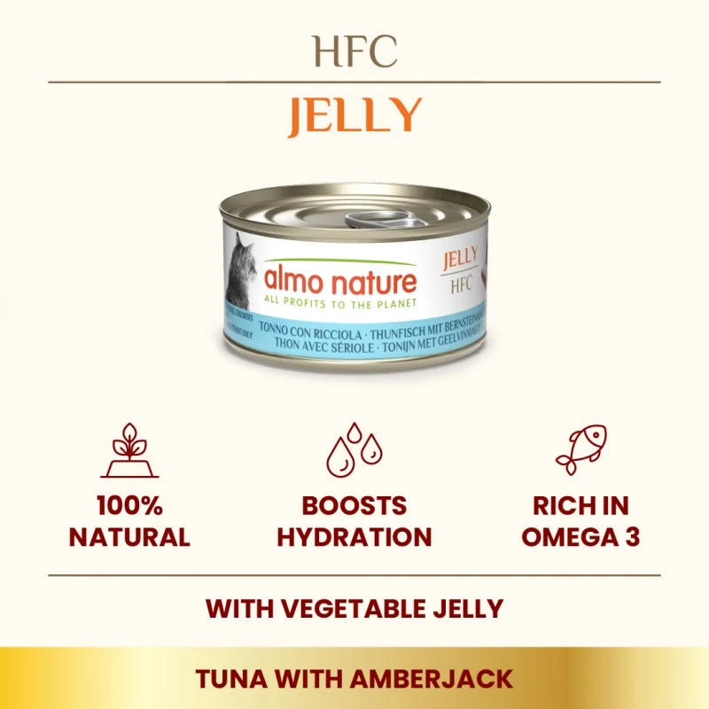 Almo Nature Cat Jelly HFC Tonijn&Geelvinmakreel 70gr. is bereid met 100% HFC (Human Food Consumption) ingrediënten die van origine voor menselijke consumptie geschikt zijn. De HFC Light recepturen zijn speciaal op de voedingsbehoeften afgestemd van katten die regelmatig last hebben van haarballen. HFC Jelly is er in verschillende varianten welke bestaan uit meer dan de helft vis of vlees, kookbouillon en 1% rijst. Katten zijn van nature slechte drinkers, daarom adviseert Almo Nature zeker in de zomermaanden deze varianten om te zorgen dat uw kat genoeg vocht binnenkrijgt.