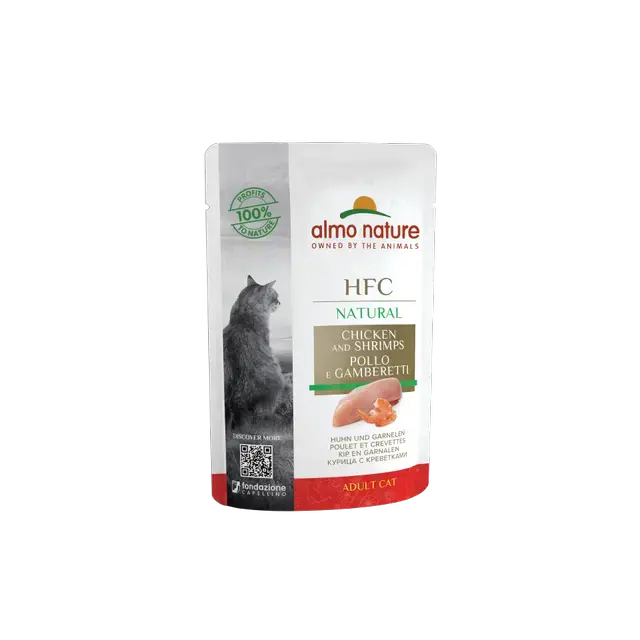 Natvoer is essentieel in de dagelijkse voeding van de kat om de hydratatie te bevorderen en het risico van urinaire aandoeningen te verminderen. Almo nature cat hfc natural pouch kip & garnaal 55 gram